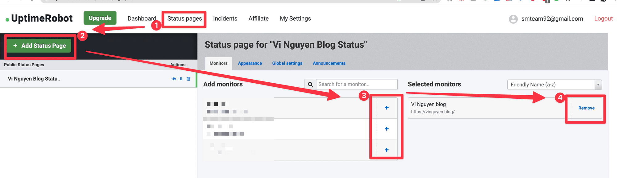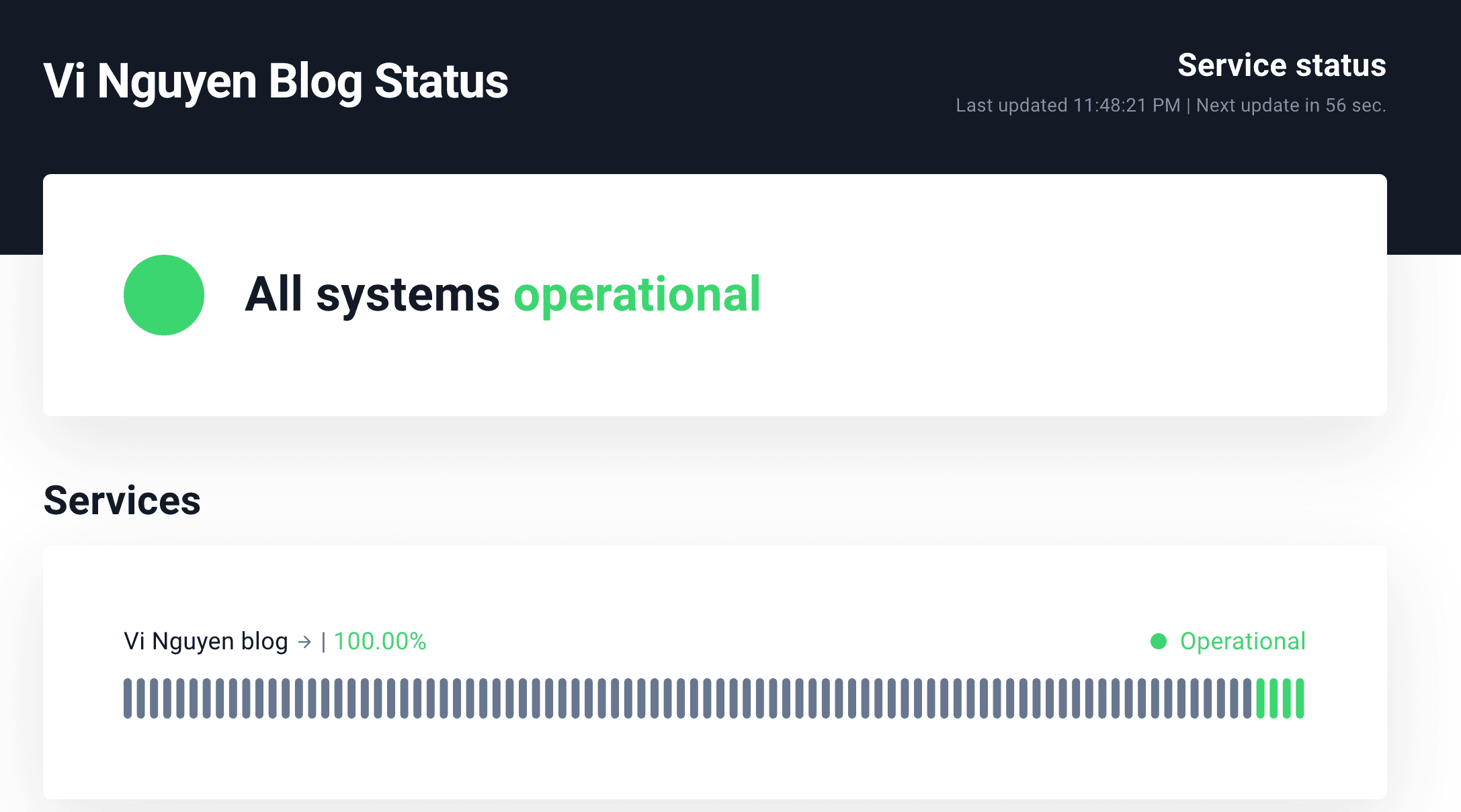 Limitation of Free version: You can not map a custom subdomain ( ex https://status.vinguyen.blog to Uptime Robot Status page), you can only view as a random generate URL: https://stats.uptimerobot.com/4GR4Vtz5k5