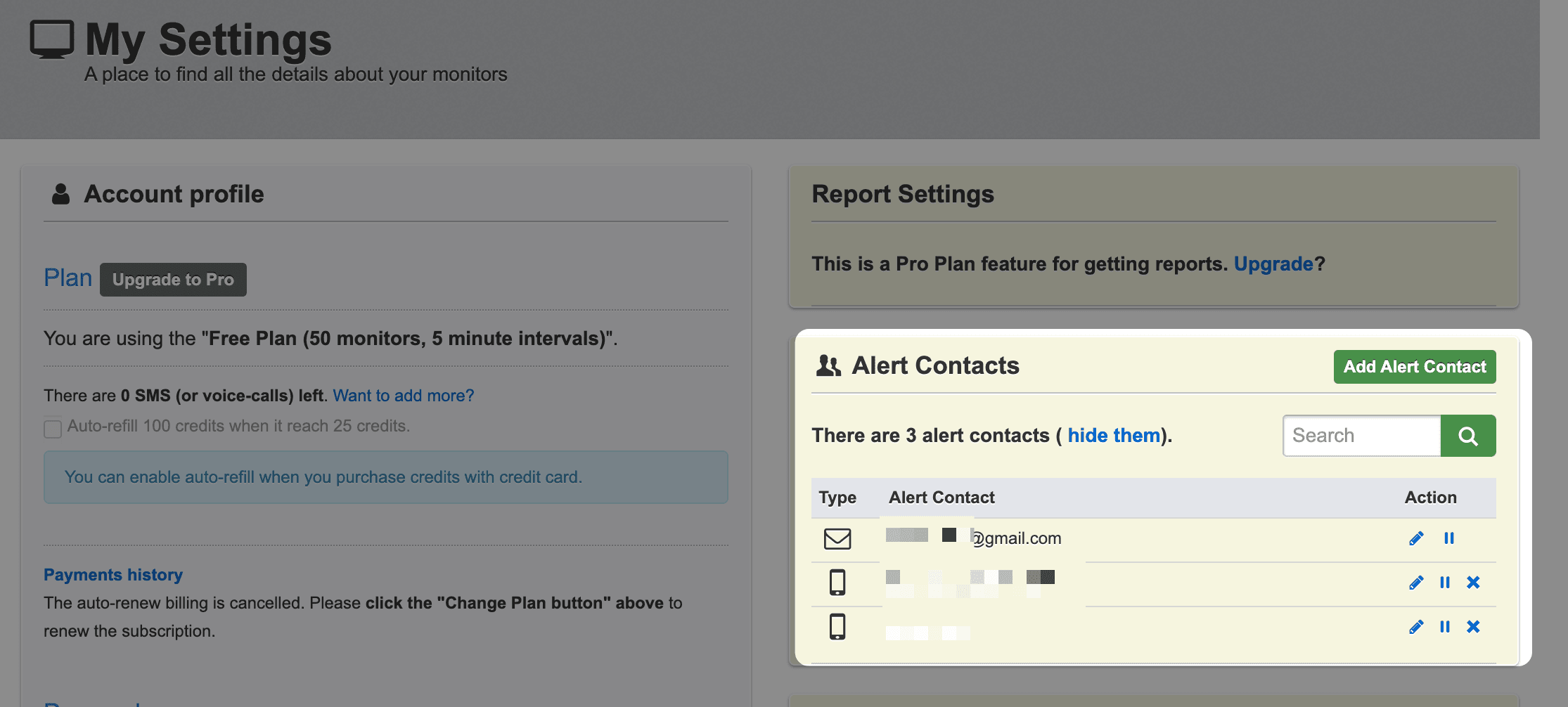 Note: Your can manage the Alert contact in the Setting: https://uptimerobot.com/dashboard.php#mySettings