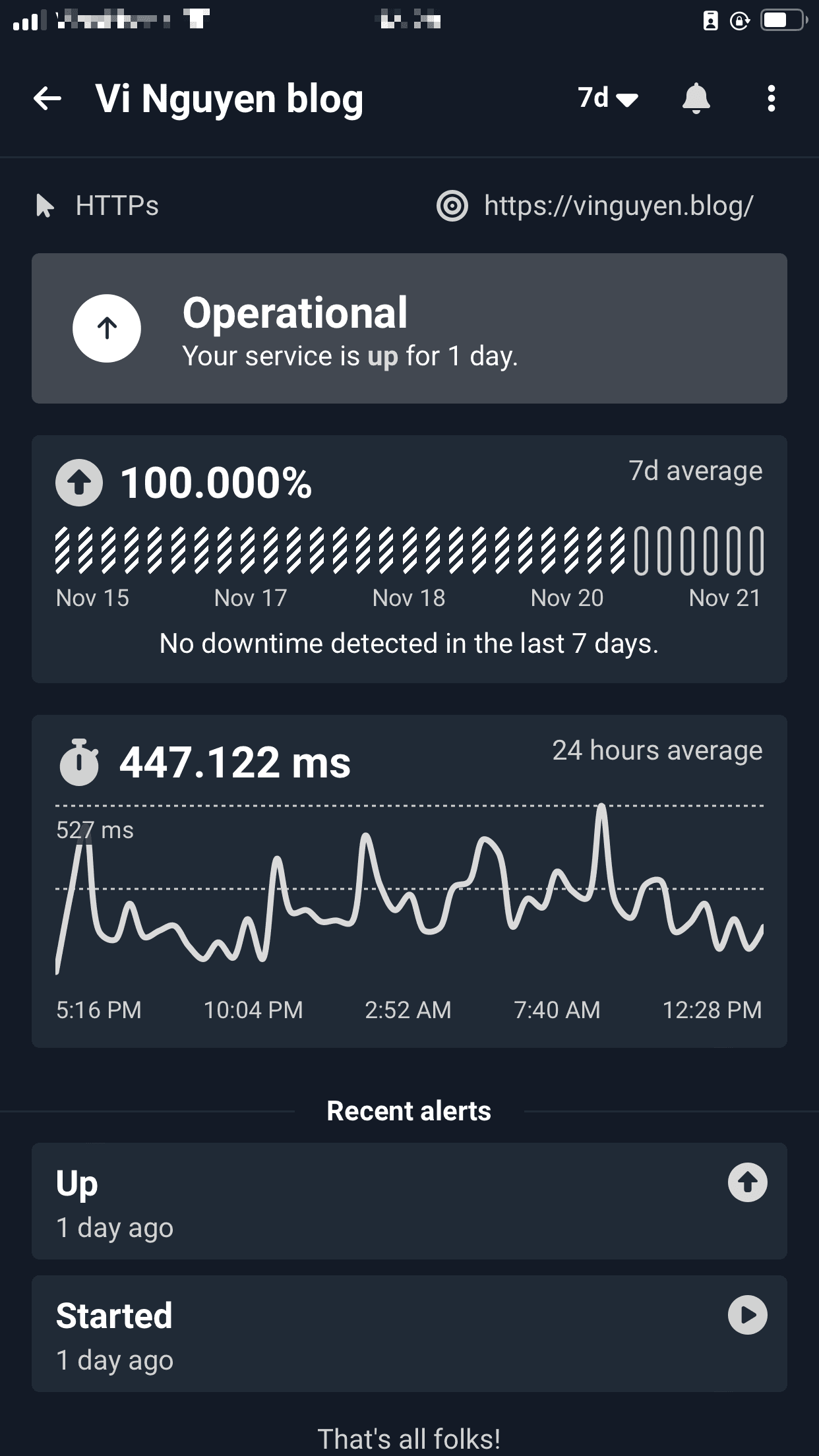 As a owner & operator of this blog, I want to know status it and make sure that it's online & server request for user when they need to read content from blog. If my blog is down, I want to receive alerts to handle it as soon as possible and keep the blog is high avaibility