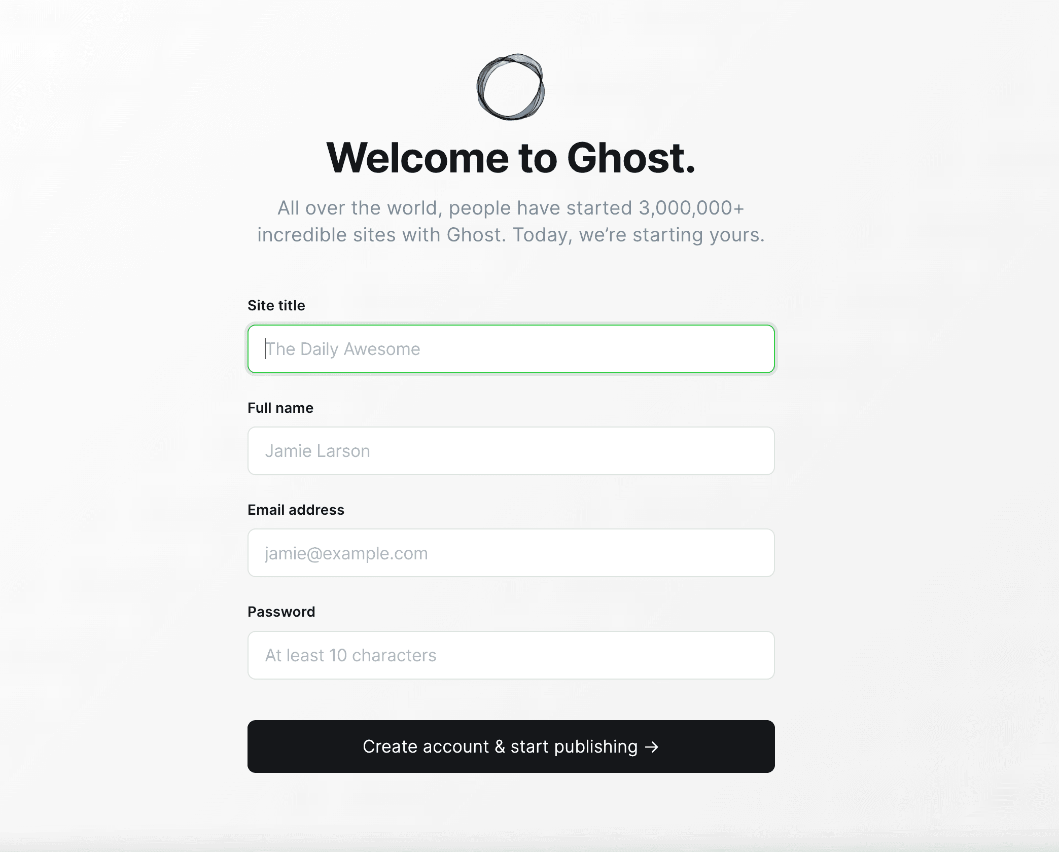 Now you can go to the ghost admin at: https://<your-blog-domain>/ghost and starting to setup the Blog: