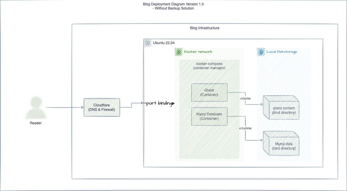 This blog is a simple monolithic application deployed with docker & managed by docker-compose running 2 containers: Ghost 5.3 & Mysql 8.0 as the diagram bellow